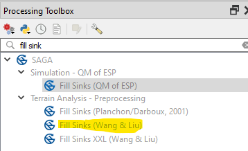 - Now run the tool after providing the parameters. In this case, the input DEM should be the sink filled DEM. You should note that SAGA uses sdat extension for raster data and shp (ESRI shapefiles) for vector data as default. Therefore we will use default file types for the output. This tool will produce various intermediate outputs as raster and vector data.