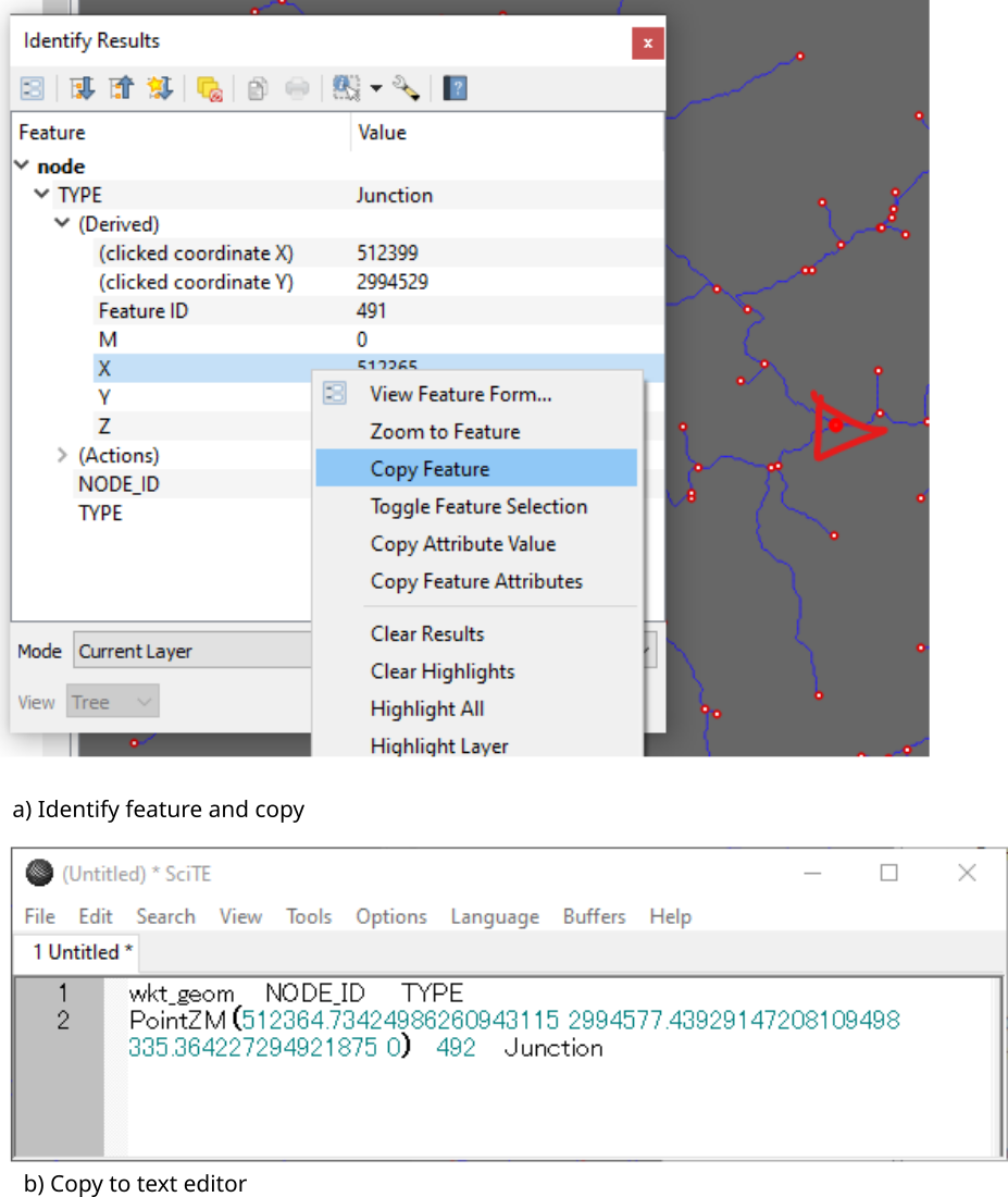 - Copy the coordinates of a river junction (node)- 1) select node in the layer 2) click identify tool, 3) select one node, 4) copy feature and 5) paste to a text editor for future use.