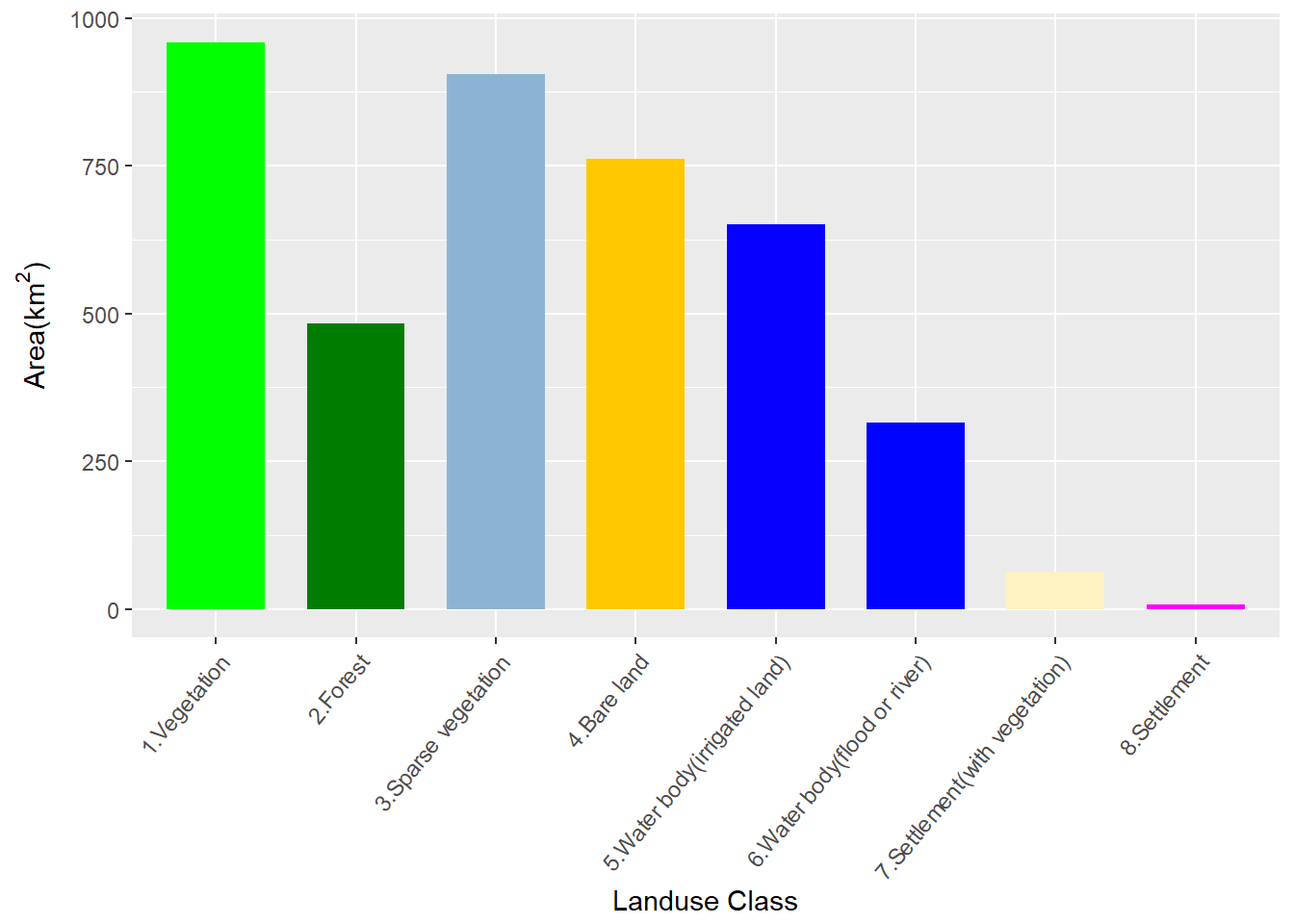 The area of each land use class as per the analysis is plotted which is shown below. According to the figure, around 315km2315km2 which is about 7%7% of the total area (4147km24147km2).
